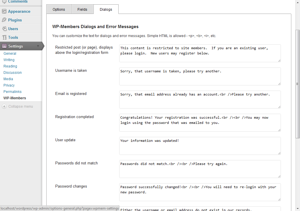 This screen allows you to customize certain dialogs and error messages that the plugin delivers on the front end. This should be self explanatory. Note that if you have selected to moderate registrations (holding them for admin approval), you should definitely change the “registration completed” dialog to something more appropriate.