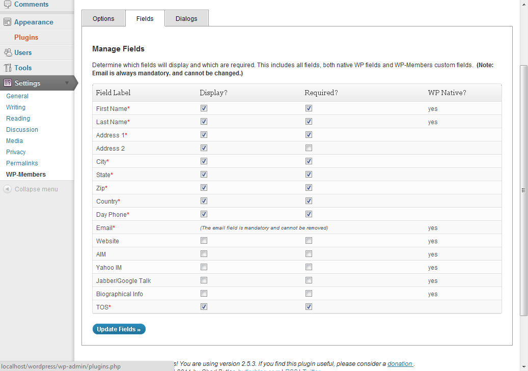 This settings screen allows you to pick which data fields will be included in your registration form and which of the selected fields will be required. Also, the plugin notes which of the fields is native to WordPress. (Note: if you have a need to customize the fields that are installed with the plugin, read this post regarding the steps to do so.)